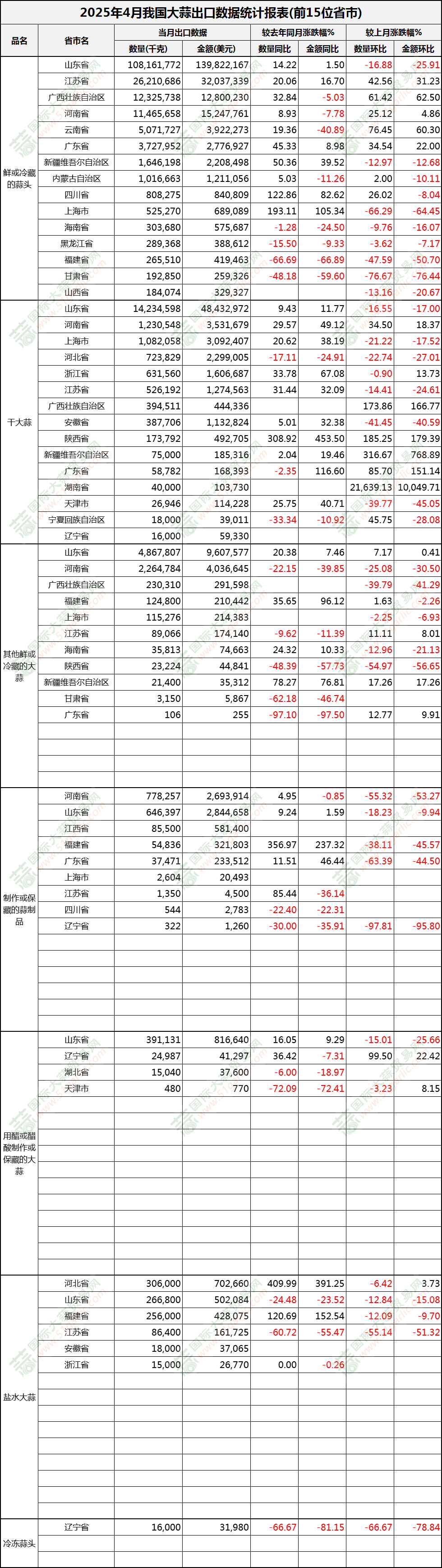 2025年4月大蒜出口數(shù)據(jù)(按省市)