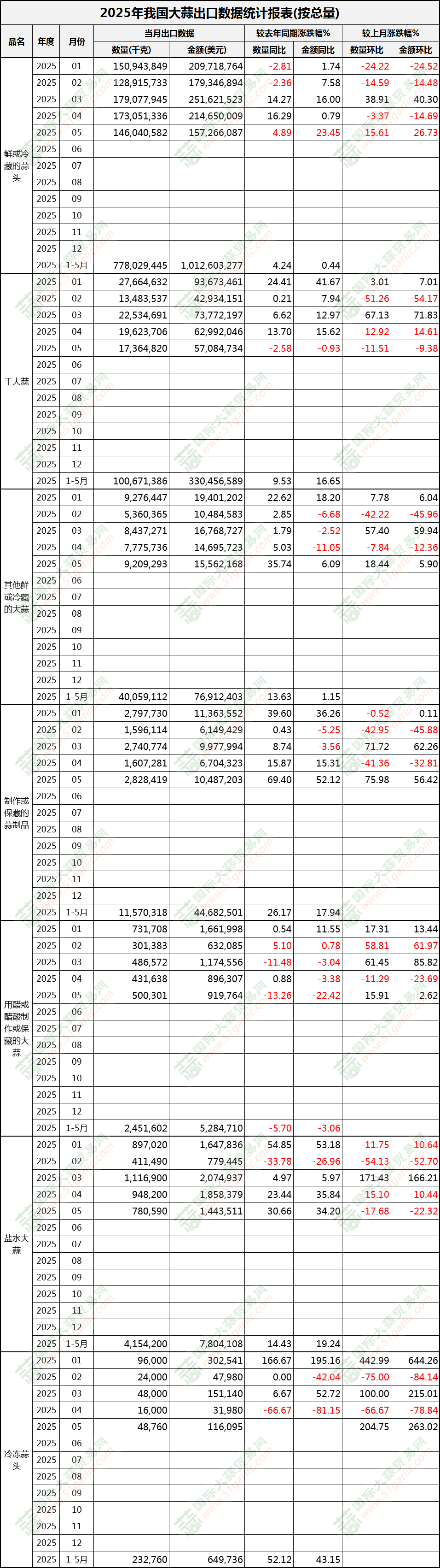 2025年5月大蒜出口數(shù)據(jù)(按總量)