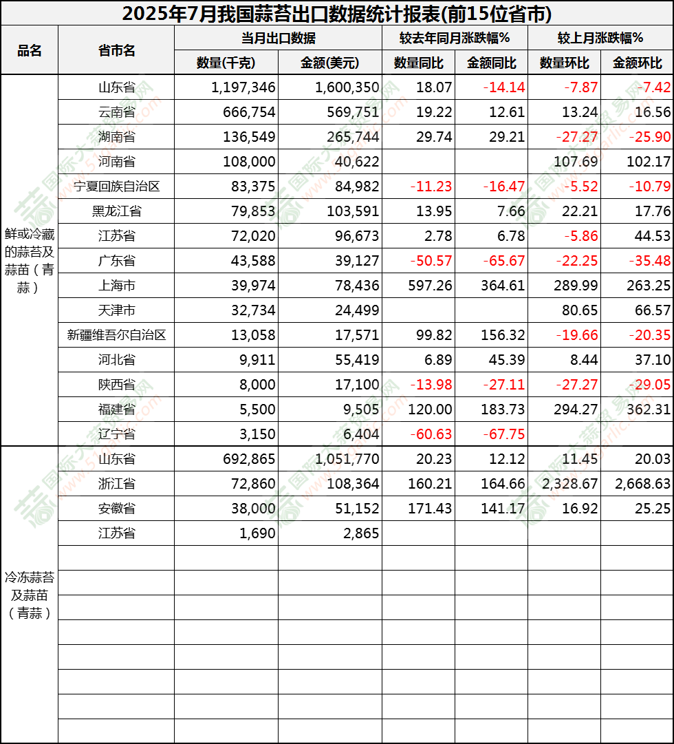 2025年7月蒜苔出口數(shù)據(jù)(按省市)