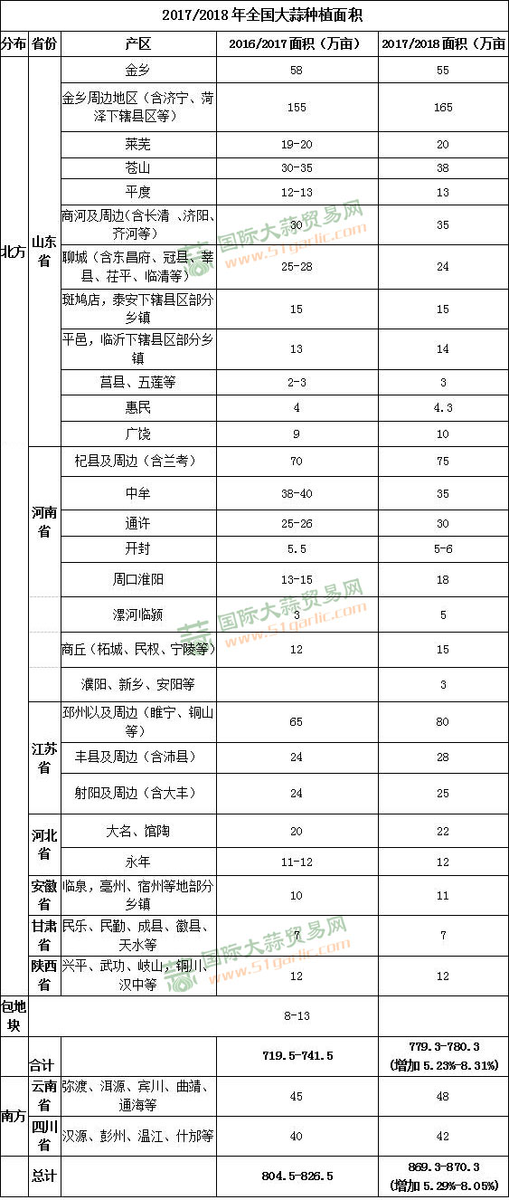 2017-2018年度全國大蒜種植面積統(tǒng)計