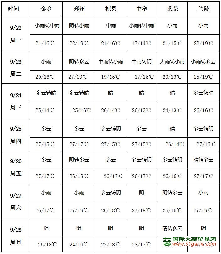 本周,大蒜產(chǎn)區(qū)普遍呈現(xiàn)多云及陰雨天氣,整體氣溫相對偏低。金鄉(xiāng)、邳州、杞縣、中牟等產(chǎn)區(qū),降水主要集中在前期和后期,前期多小雨、中雨天氣,后期也有小雨出現(xiàn),中期則以多云或晴好天氣為主。氣溫方面,最高溫大多在 20 - 28℃之間,最低溫基本處于 13 - 19℃范圍。持續(xù)的降雨或大雨可能導(dǎo)致田間積水,進(jìn)而影響大蒜的正常播種,并可能致使部分產(chǎn)區(qū)的種植時間被迫延后。