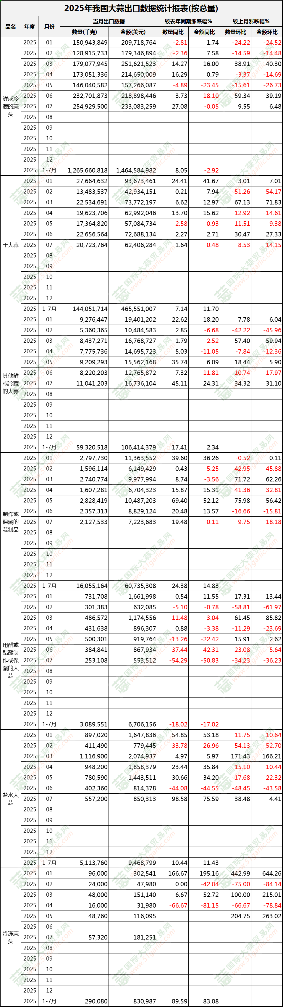 2025年7月大蒜出口數(shù)據(jù)(按總量)